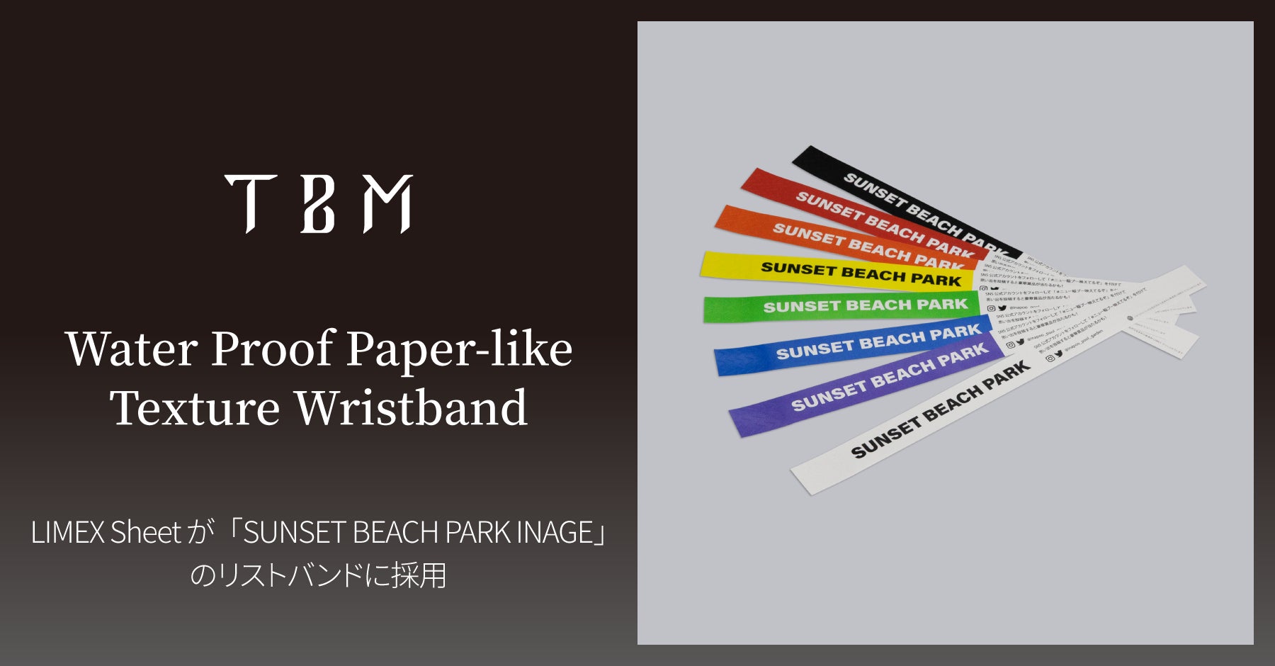 株式会社TBM(本社:東京都千代田区、代表取締役CEO:山﨑敦義、以下TBM)の石灰石を主原料とする「LIMEX Sheet(ライメックスシート)」が、株式会社ワールドパーク(本社:千葉県千葉市、代表:石山高広、以下ワールドパーク)が運営する「SUNSET BEACH PARK INAGE*(サンセット・ビーチ・パーク・イナゲ)」内の稲毛海浜公園プールへの入場者用リストバンドに採用されました。