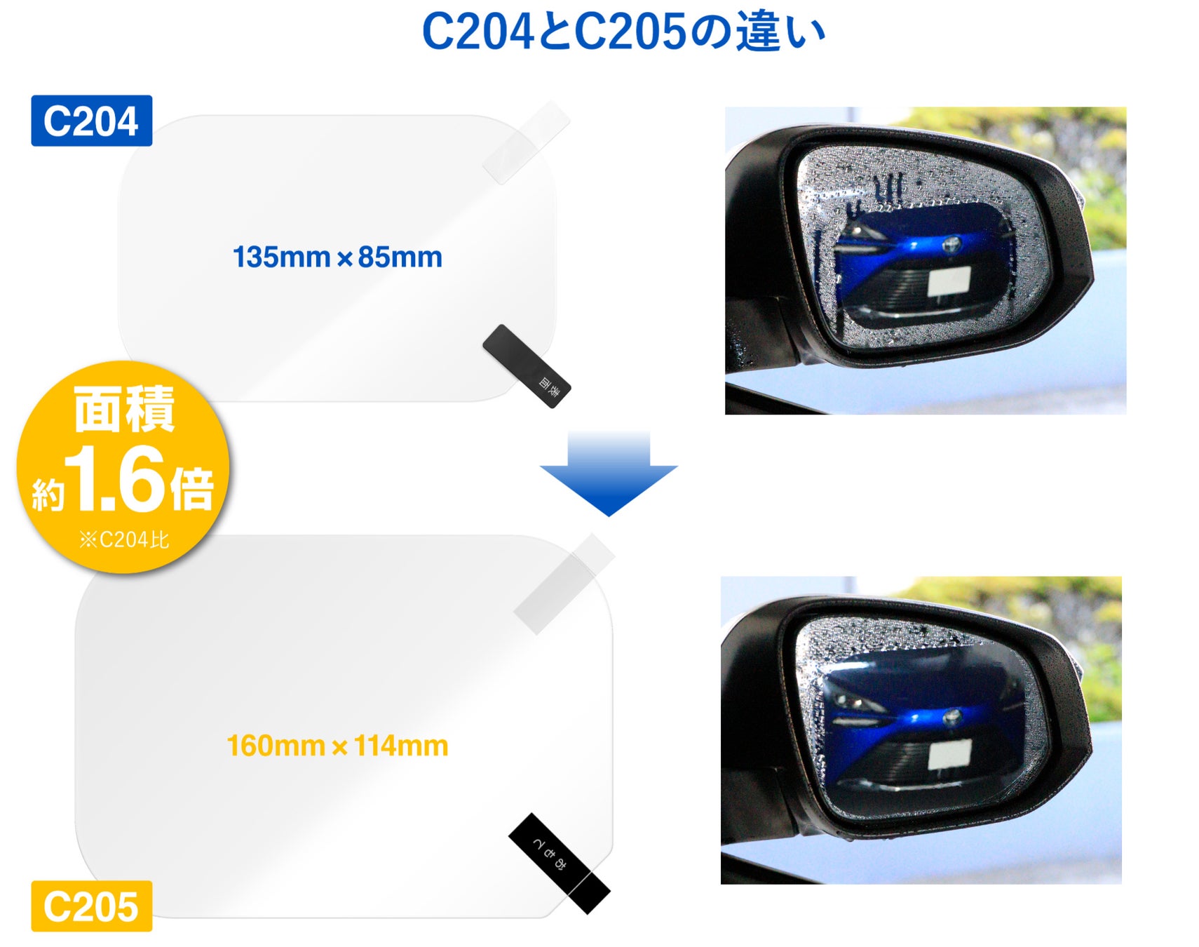 一方で、一部のユーザーからは「ミラーに対してフィルムが小さい」との声が寄せられ、この度フィルムサイズを約1.6倍拡大した「C205」を新たに追加。ミニバンやSUVなどの大型サイドミラーでも広範囲をカバーでき、多くの車種で汎用的に使用できる形状にしました。