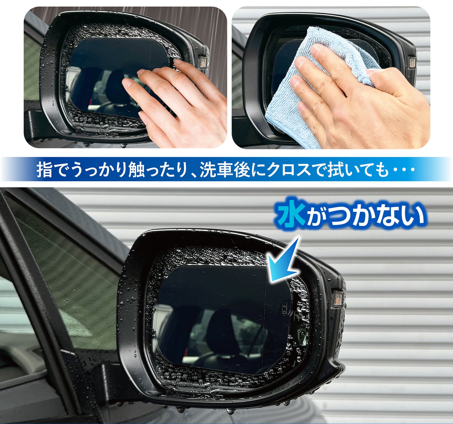 超撥水とは、物体表面の目に見えない超微細な突起により、水が表面に付かずに水滴となって跳ねる現象です(上画像)。当社は、2001年よりこの現象を自動車向けに応用した超撥水コート剤(下画像)を開発してきましたが、触れると簡単に効果が失われる耐久性の低さが課題でした。そこで2024年4月に、触れても超撥水構造が壊れにくい特殊なフィルムを採用した「ゼロワイパー フィルムタイプ サイドミラー用(C204)」を発売。水滴がミラーに付着しない見さすさと耐久性が評価されました。