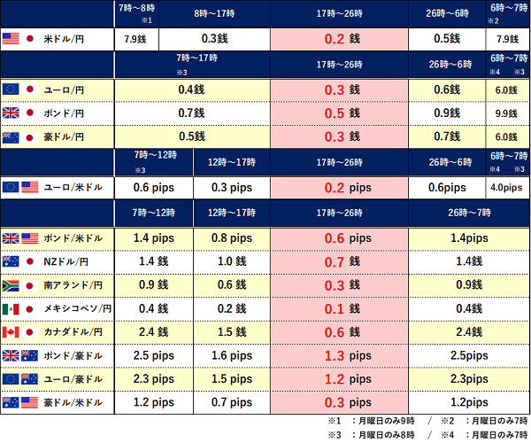 ※主要経済指標発表時等の急変時、国内外の休日や平日早朝など著しい流動性低下時はやむをえずスプレッドを拡大する場合がございます。 メンテナンス時間(火曜日~金曜日 各日5:55~6:10、土曜日5:50~月曜日7:00)は適用時間に含まれません。
