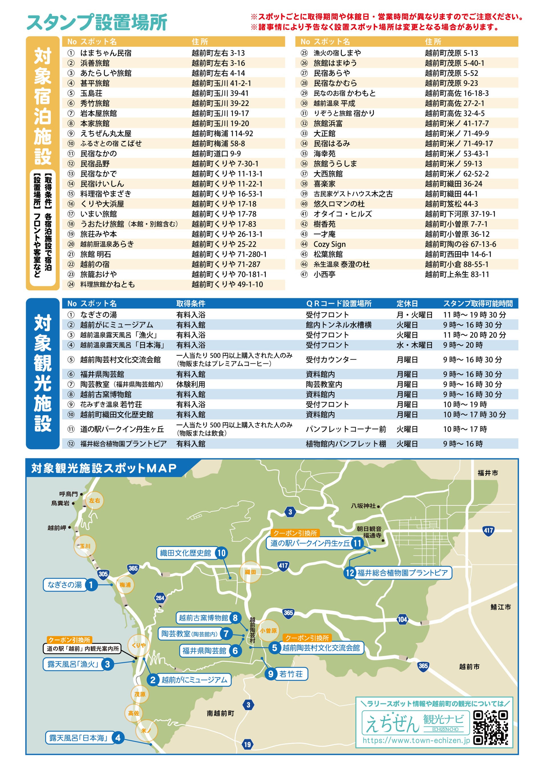 福井県越前町内の宿泊施設47施設と観光施設12施設を対象に、宿泊施設で泊まることで取得できる【宿泊施設スタンプ】と観光施設を利用して取得できる【観光施設スタンプ】の2種類を集めることで、越前町内の100以上の店舗や施設で利用できる「観光クーポン券」2,000円分と引換できます。