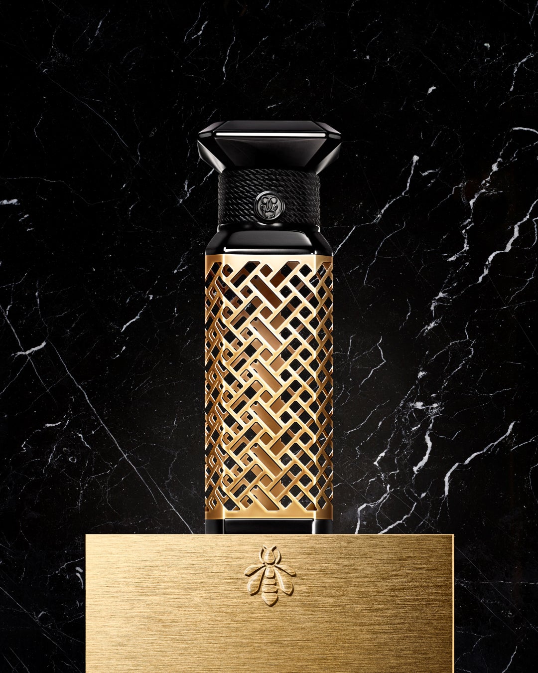 メゾンの伝統が息づくケースのデザインは、1990年に誕生したスプレー〈アビ ドゥ フェット〉からインスピレーションを得た、クロワジヨンモチーフが全体を飾ります。透かしのあるモチーフに光が通ることで、スリーブ部分のゴールドとフレグランスの色が相互に高まり合い、輝きとエレガントさを引き立てます。