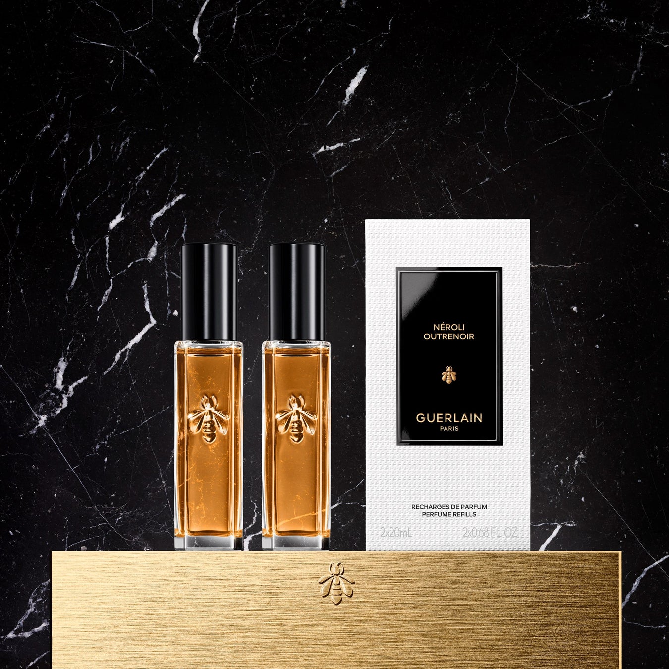 輝かしく華奢なガラスボトルに収められたリフィルにも、〈ラール エ ラ マティエール〉のアイコニックなラインが落とし込まれています。クリスタルを思わせるガラスの輝き、スリーブに完璧に収まるよう設計されたボトルの繊細さ、ボディに刻まれたミツバチの姿など、ゲランのボトル作りのあらゆるノウハウが、まるで宝石のようなオブジェの中に表現されています。皇帝ナポレオン三世のシンボルであったミツバチは、1853年以来、ゲランのクリエイションのボトルを彩ってきました。