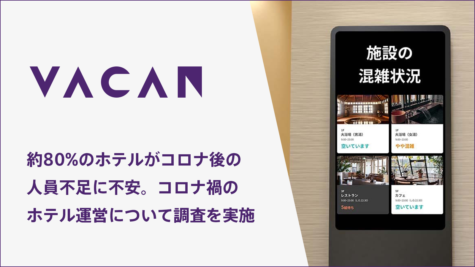 AI×IoTを活用してあらゆる混雑を可視化・抑制するスタートアップ、株式会社バカン(東京都千代田区、代表取締役:河野剛進、以下「バカン」)は、宿泊予約数が増加傾向になるなど需要の回復を見せつつある旅行業界に対して、今後の対応やトレンドを明らかにすることを目的とした「新型コロナウイルス流行後におけるホテル運営実態調査」を実施しました。その結果、コロナ後の人員不足への不安や、お客様からいただくクレームとしてフロント混雑、朝食会場待ち列、浴場施設混雑など、混雑管理への意見が多くでているなどの結果が明らかとなりました。
