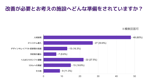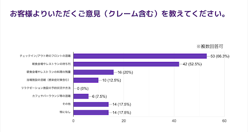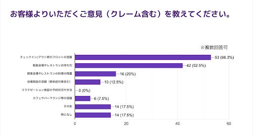 約80%のホテルがコロナ後の人員不足に不安を持つ。フロントや朝食会場などの待ちや混雑への課題感も顕著に