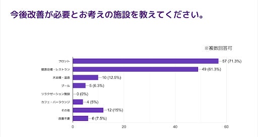 ・多くの事業者が今後改善が必要と考えている箇所として、「フロント(71%)」「朝食会場・レストラン(61%)」などを回答。