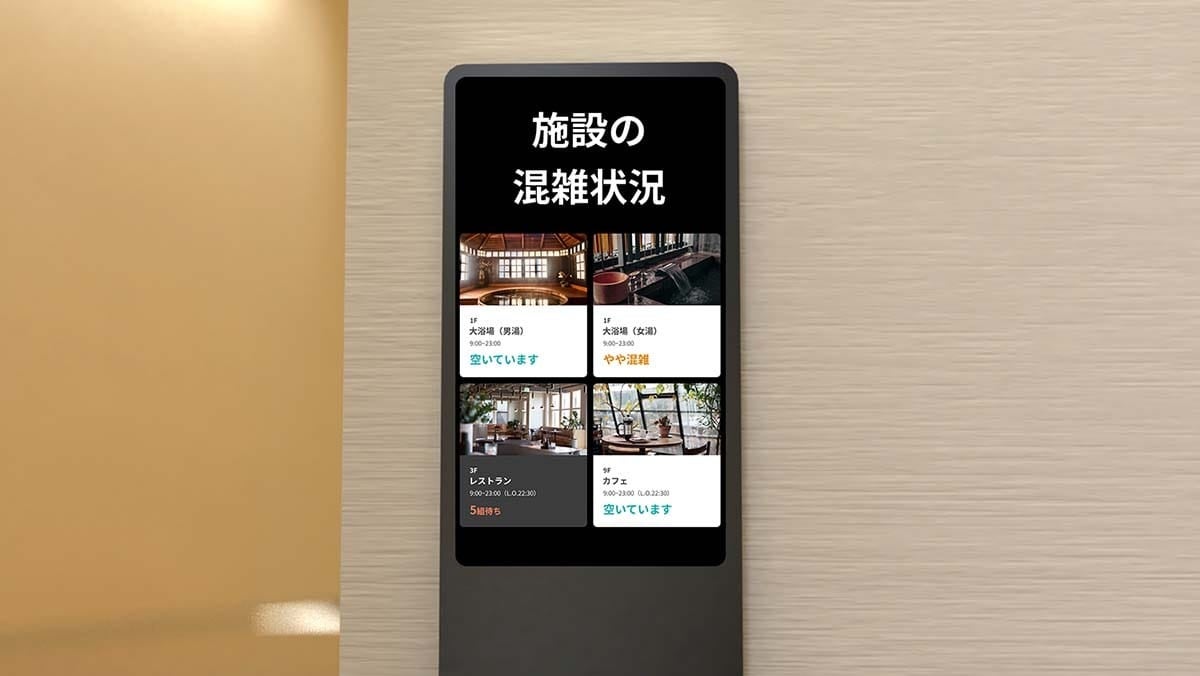 本調査の結果を踏まえて、バカンではホテル向けに混雑可視化、抑制用DXプランの提供を開始しています。フロントや朝食会場での待ち列の管理や、各施設の混雑状況をサイネージで見える化することで「お客様の満足度向上」と「人件費削減」を実現します。