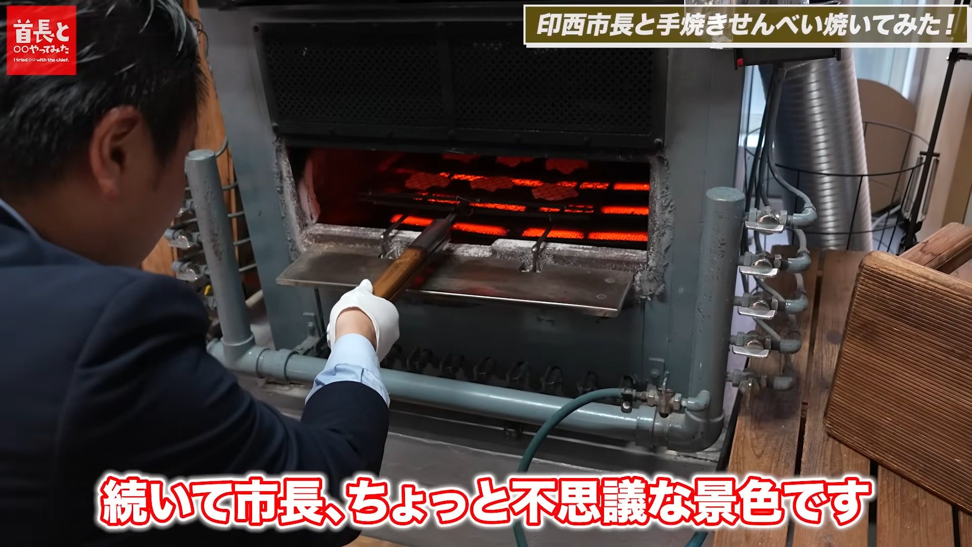 印西市長・藤代健吾氏が自ら地元の魅力をアピールすべく、YouTube番組『首長と○○やってみた』でスーツ姿でせんべい焼き体験!