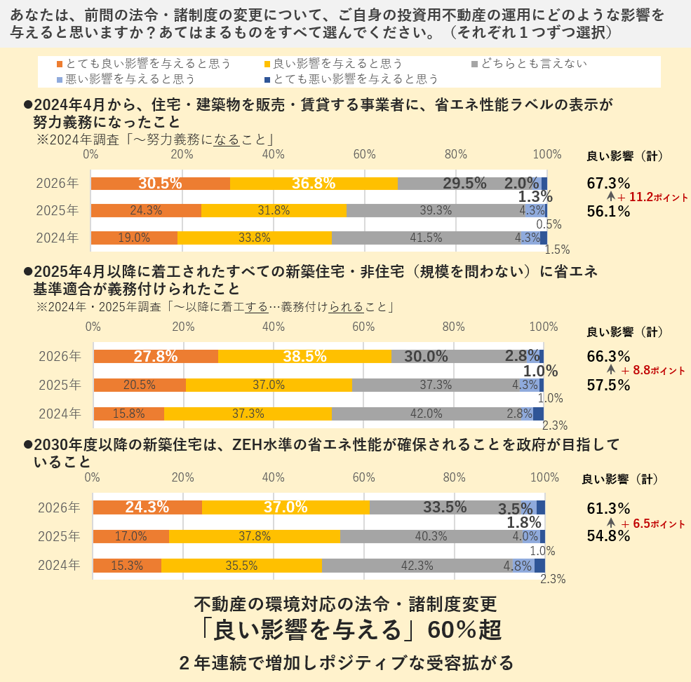 最近の不動産の環境対応の法令・諸制度変更については、住宅・建築物を販売・賃貸する事業者に省エネ性能ラベルの表示の努力義務、新築住宅・非住宅に省エネ基準適合の義務付け、新築住宅にZEH水準の省エネ性能の確保(2030年度以降目標)などがありますが、所有する投資用不動産の運用に良い影響を与えると考える所有者が6割を超えています。