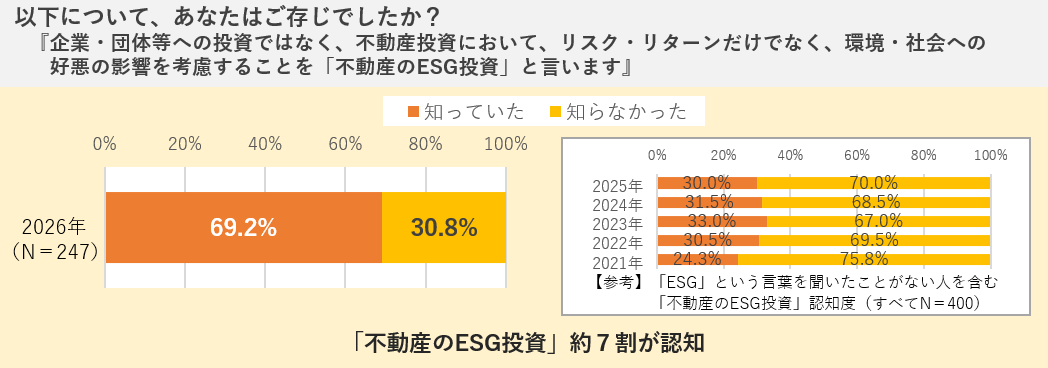 「ESG」という言葉を聞いたことがあると回答した人に対し、「不動産のESG投資」の認知を尋ねたところ、「知っていた」は69.2%でした。 なお、「不動産」と「ESG」の両語を合わせて報道する新聞記事数は、ピーク時(2021年)から半減していますが(当社調べ)、ESGという言葉自体を認知している不動産投資家の間では一定の浸透が進んだ結果といえるでしょう。