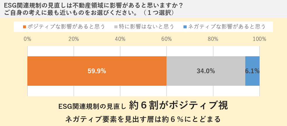 欧米を中心に、規制の簡素化や情報開示の負荷軽減、化石燃料の採掘・活用など“脱炭素の揺り戻し”ともいえる動きがみられるなかで、ESG関連規制の見直しが不動産に与えるポジティブな影響については約6割が前向きにとらえています。