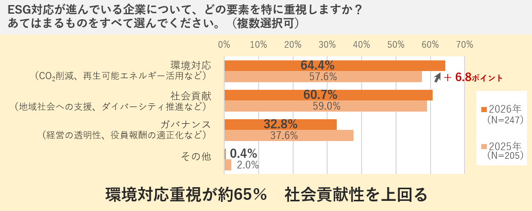 「ESG」という言葉を聞いたことがあると回答した人に対し、ESG対応が進んでいる企業についてどの要素を特に重視するか複数回答で尋ねました。この結果、「環境対応」(64.4%)が前年比6.8ポイント増で、前年トップの「社会貢献」(60.7%)を上回り最多となりました。他方、「ガバナンス」(32.8%)は前年より約5ポイント減少して上位2項目の約5割ほどにとどまり、両者との差が広がっています。
