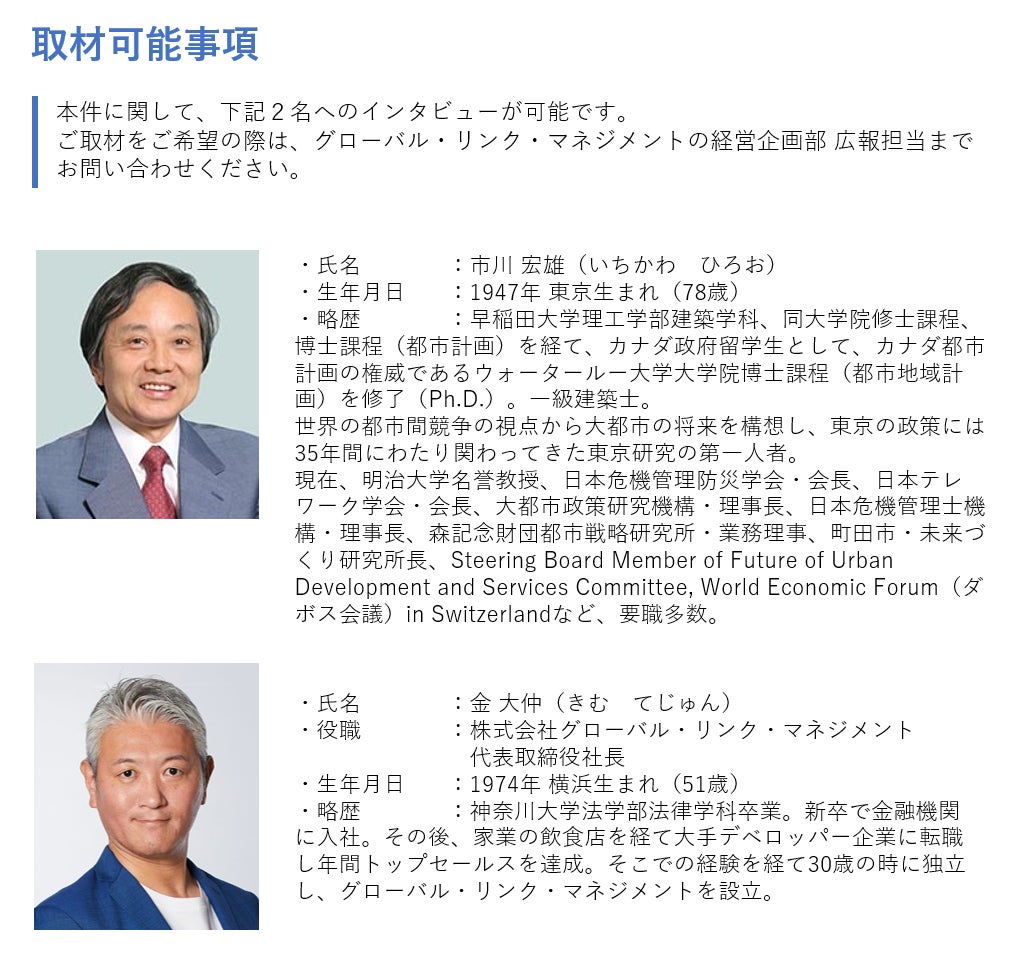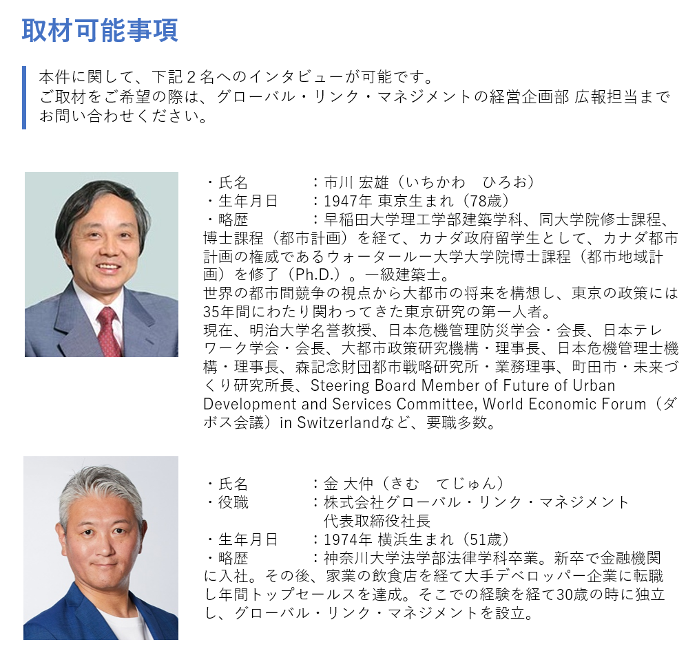 投資用不動産を扱う株式会社グローバル・リンク・マネジメント(本社:東京都渋谷区、以下GLM)は、(1)東京という都市を分析しその魅力を世界に向けて発信すること、(2)不動産を核とした新しいサービスの開発、等を目的に、明治大学名誉教授 市川宏雄 氏を所長に迎え、「グローバル都市不動産研究所(以下、同研究所)」を2019年1月1日に設立しました。