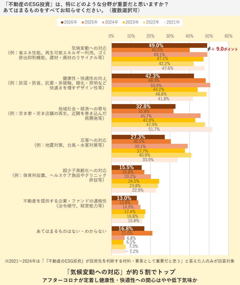 不動産のESG投資の認知有無を問わず、どのような分野で重要だと思うかを複数回答で尋ねました。この結果、最多は「気候変動への対応」(49.0%)で前年比9ポイント増となった一方、前年首位の「健康性・快適性の向上」は42.3%と6ポイント減少しました。続く「地域社会・経済への寄与」「災害への対応」は約30%、以降順位の項目も15%前後で、前年結果とほぼ同水準となっています。