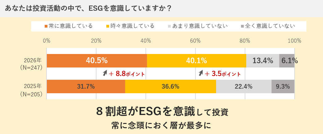 ESGという言葉の認知率の向上および理解の浸透に伴い、ESGの枠組みを前提として日々の投資活動を行う層が着実に増えているといえそうです。
