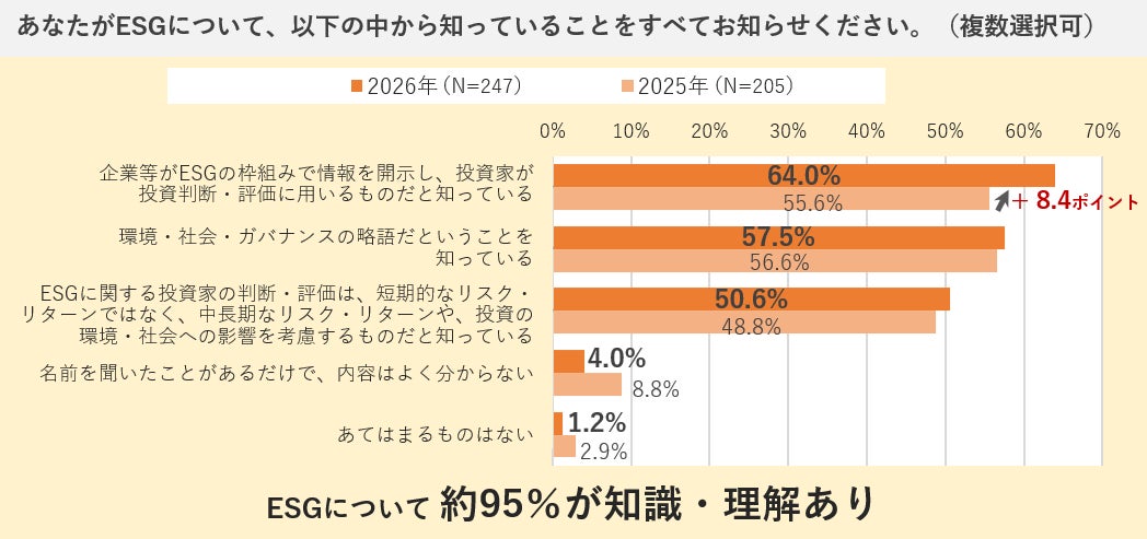 「ESG」という言葉を聞いたことがあると回答した人に対し、その内容の理解度として、ESGについて知っていることを複数回答で尋ねました。 「企業等がESGの枠組みで情報を開示し、投資家が投資判断・評価に用いるものだと知っている」(64.0%)が前年比8.4ポイント増で最多となり、前年トップの「環境・社会・ガバナンスの略語だということを知っている」(57.5%) を上回りました。また、「ESGに関する投資家の判断・評価は、短期的なリスク・リターンではなく、中長期なリスク・リターンや、投資の環境・社会への影響を考慮するものだと知っている」も半数を超え、知識・理解がない層は5%ほどにとどまっています。言葉の認知にとどまらず、投資判断・評価の枠組みとしての理解も広まりつつあるといえるでしょう。