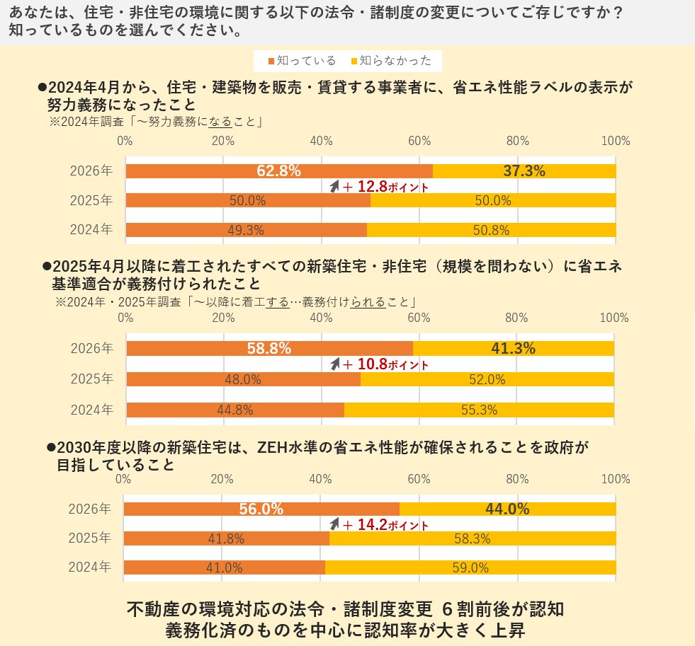 日本の住宅・非住宅の環境に関わる法令・諸制度の変更について、昨今の主な動きをいくつか提示し、変更された、ないし今後される可能性があることを知っているか尋ねました。