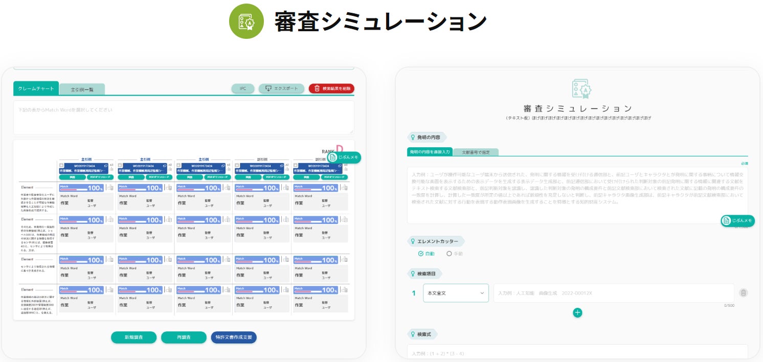特許検索機能は「かんたん検索」と「詳細検索」が備わっており、IP Landscapeの実現を可能とします。特許評価機能である「AI審査シミュレーション」では、AIが特許取得の可能性をAからDで評価、特許申請の成功確率を予測します。さらに、特許作成機能である「特許文書作成」では、従前のAI Samuraiの技術にChatGPTを搭載することで、より高品質な特許⽂書作成を実現します。