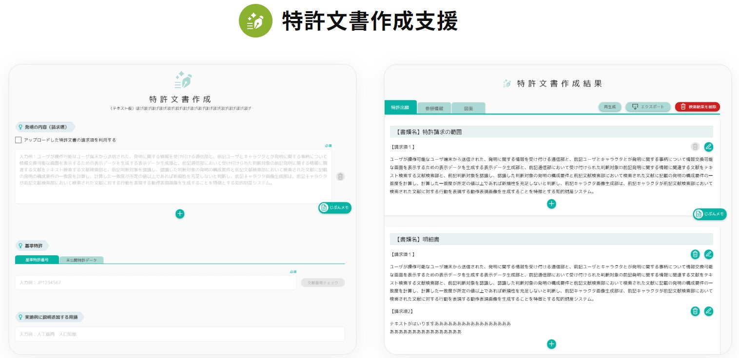 また、特許文書作成支援は、「GPT-3.5」という生成AIを活用し、より特許文書らしく表現を可能とし、特許出願の手間と時間を効果的に削減できます。専門的な知識がなくても、簡単かつ効率的に特許文書を完成させることができる革新的な製品です。