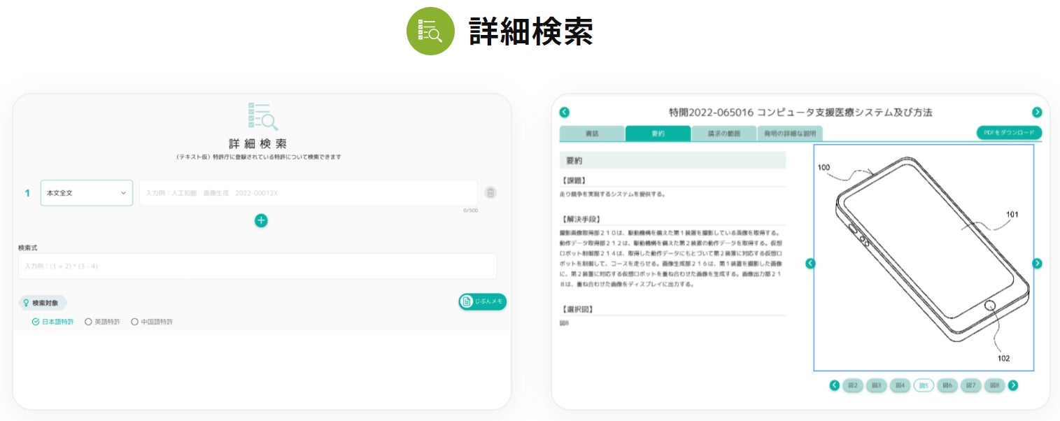 特許の検索・評価・作成の全機能を網羅した、発明の創出から特許の権利取得までをワンストップでサポートするAI搭載型の特許システムです。