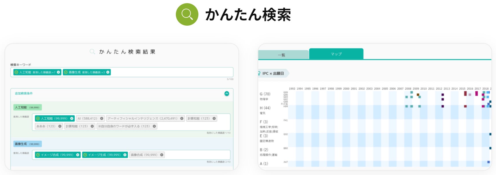 キーワード入力の度に瞬時に検索結果が表示されるインクリメンタルサーチ方式を採用し高速検索を簡単に行うことが可能で、特許情報の初期探索に最適です。入力したキーワードに対して類義語の提案も実行し、キーワードを入力するだけで、関連する特許情報を迅速にリストによって、一覧確認を可能とし、IP Landscape化されたマップも確認できます。瞬時に広範囲の特許を把握可能とし、目的に合った特許情報を手に入れることができます。