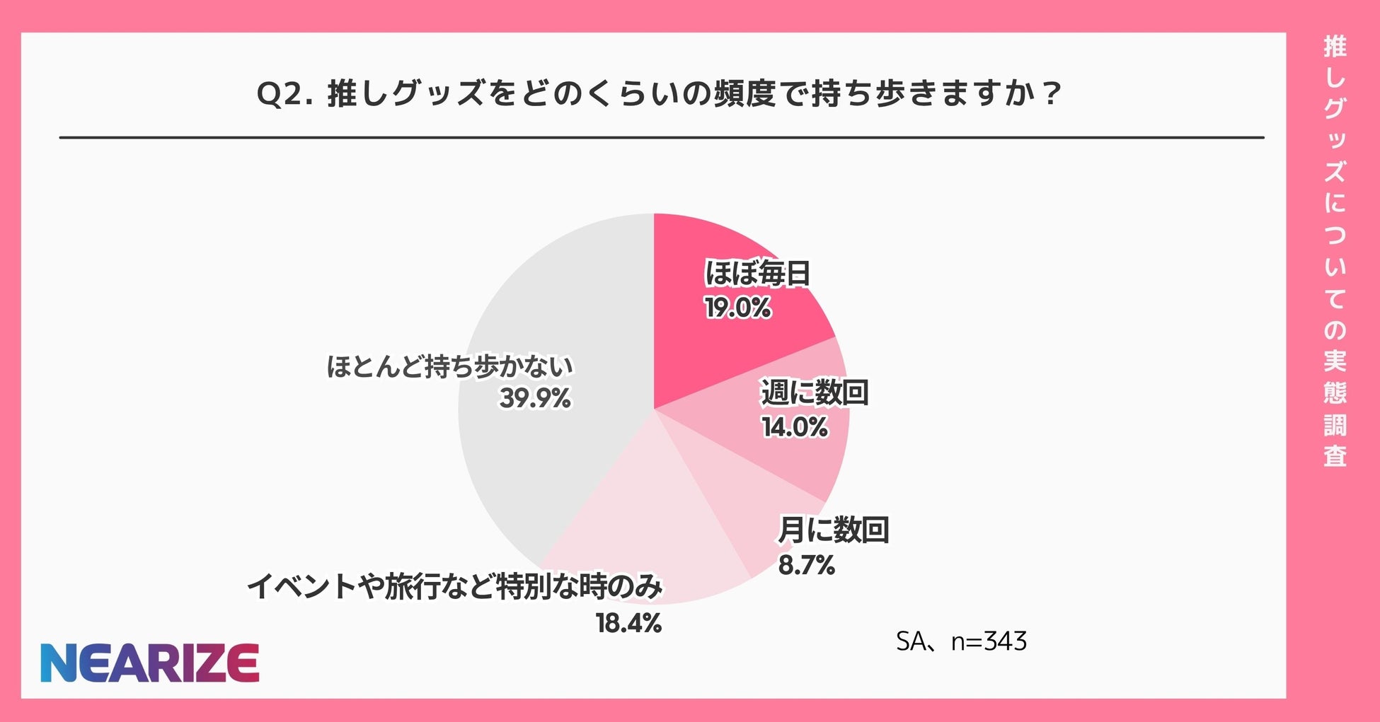 中でも「ほぼ毎日」持ち歩く人が19.0%、「週に数回」が14.0%、「イベントや旅行など特別な時のみ」が18.4%と、シーンは違っても“推しと一緒にいたい”という気持ちは多くの人に共通しているようです。