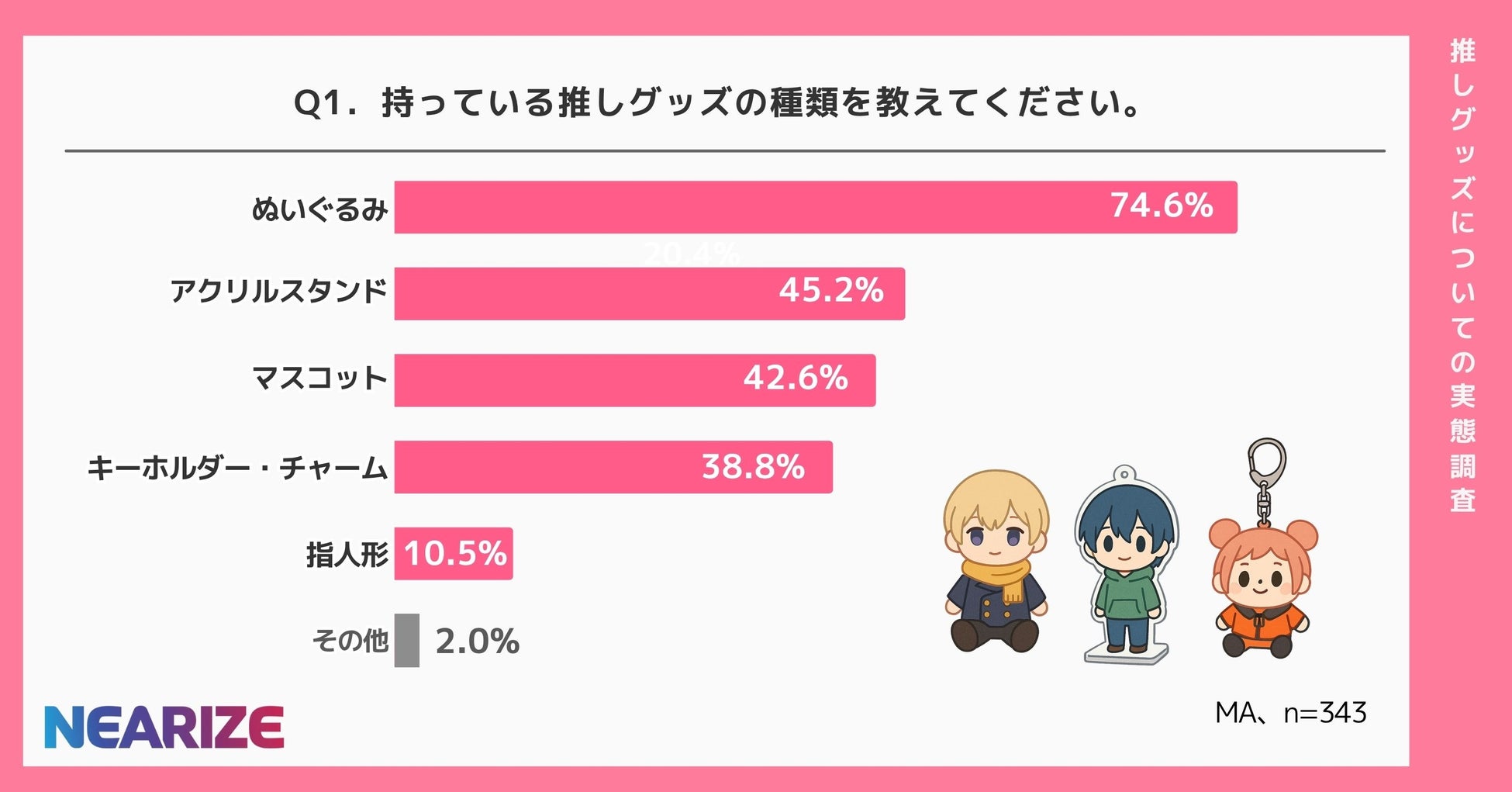 今回の調査では、最も多かったのが「ぬいぐるみ」で74.6%。約4人に3人が推しの“ぬい”を持っている結果となりました。
