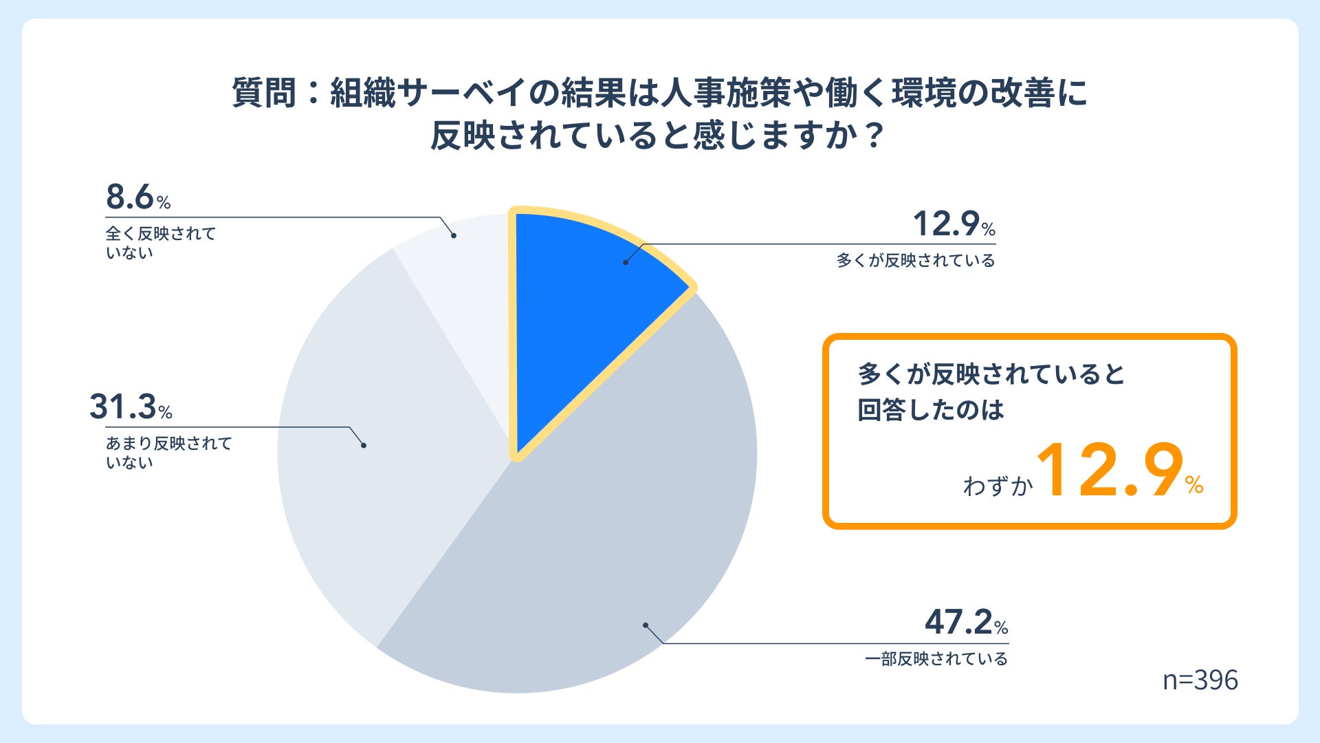 組織サーベイを実施する企業に所属する従業員へ「組織サーベイの結果は人事施策や働く環境の改善に反映されていると感じますか?」という質問を行ったところ「多くを反映できている」企業は12.9%に留まる結果となりました。