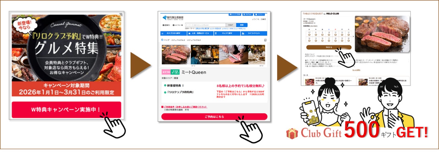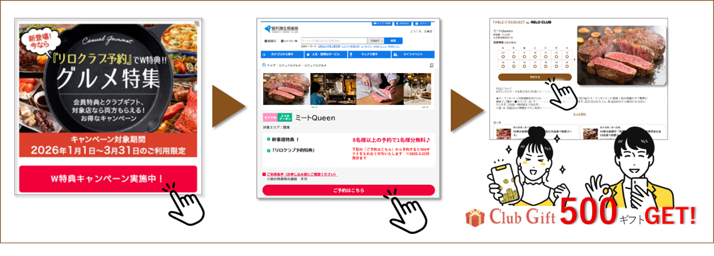 W特典キャンペーンでは、福利厚生倶楽部の通常の特典サービスに加えて、『リロクラブ予約』*2 から「TABLE REQUEST by RELO CLUB」を経由して、対象の飲食店を予約し食事をすると、もれなく500ギフトが会員に付与されます。*3