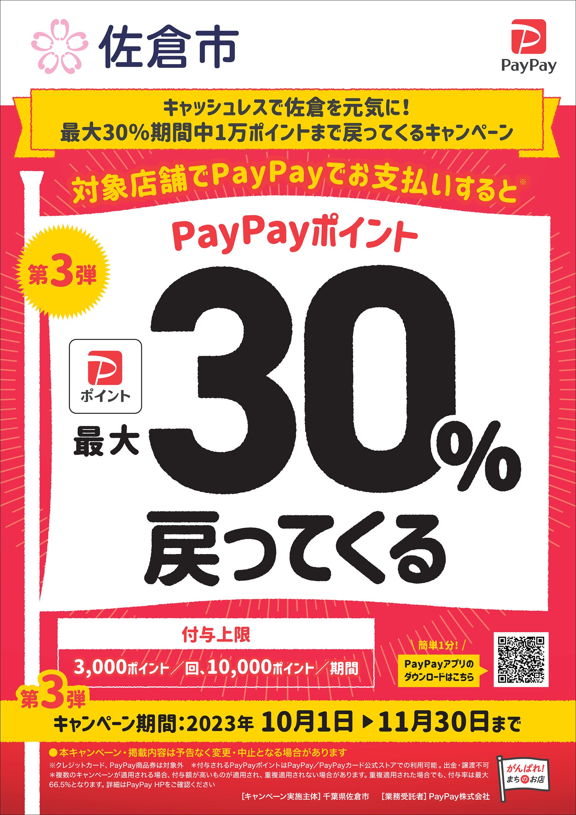 佐倉市内の対象店舗(大手チェーン店・コンビニ等を除く中小店舗)においてPayPayで支払うと、お支払金額の最大30%分のポイントを付与します。