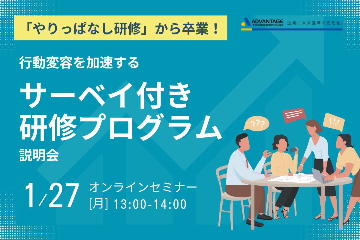 株式会社アドバンテッジリスクマネジメントは、2025年1月27日(月)に人事・総務・労務・人材育成/人材開発部門の責任者様、ご担当者様を対象としたWebセミナー「『やりっぱなし研修』から卒業!行動変容を加速する『サーベイ付き研修プログラム』説明会」を開催いたします。本セミナーは当社の研修プログラム開発者が講師として登壇し、「なぜ研修がやりっぱなしになってしまうのか?」その理由をご紹介しながら、研修の効果をより発揮するため必要なポイントを解説いたします。