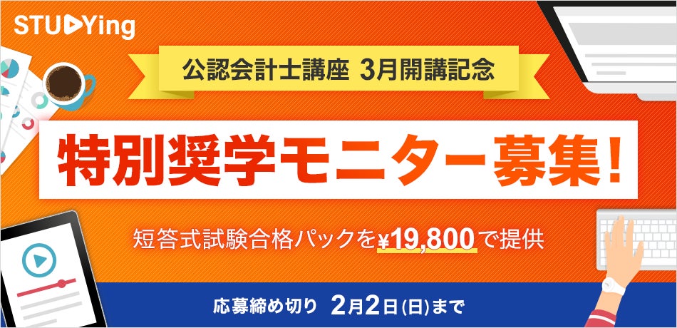 オンライン資格取得講座「STUDYing(スタディング)」を提供するKIYOラーニング株式会社(東京都千代田区、代表取締役社長:綾部貴淑)は、2025年3月に公認会計士講座を開講いたします。1月8日に「スタディング」公式サイト内において、公認会計士講座のご紹介ページを先行公開いたしました。さらに同日より、公認会計士の短答式試験対策講座を19,800円でご利用いただける「特別奨学モニタ―」の募集を開始しましたのであわせてお知らせいたします。