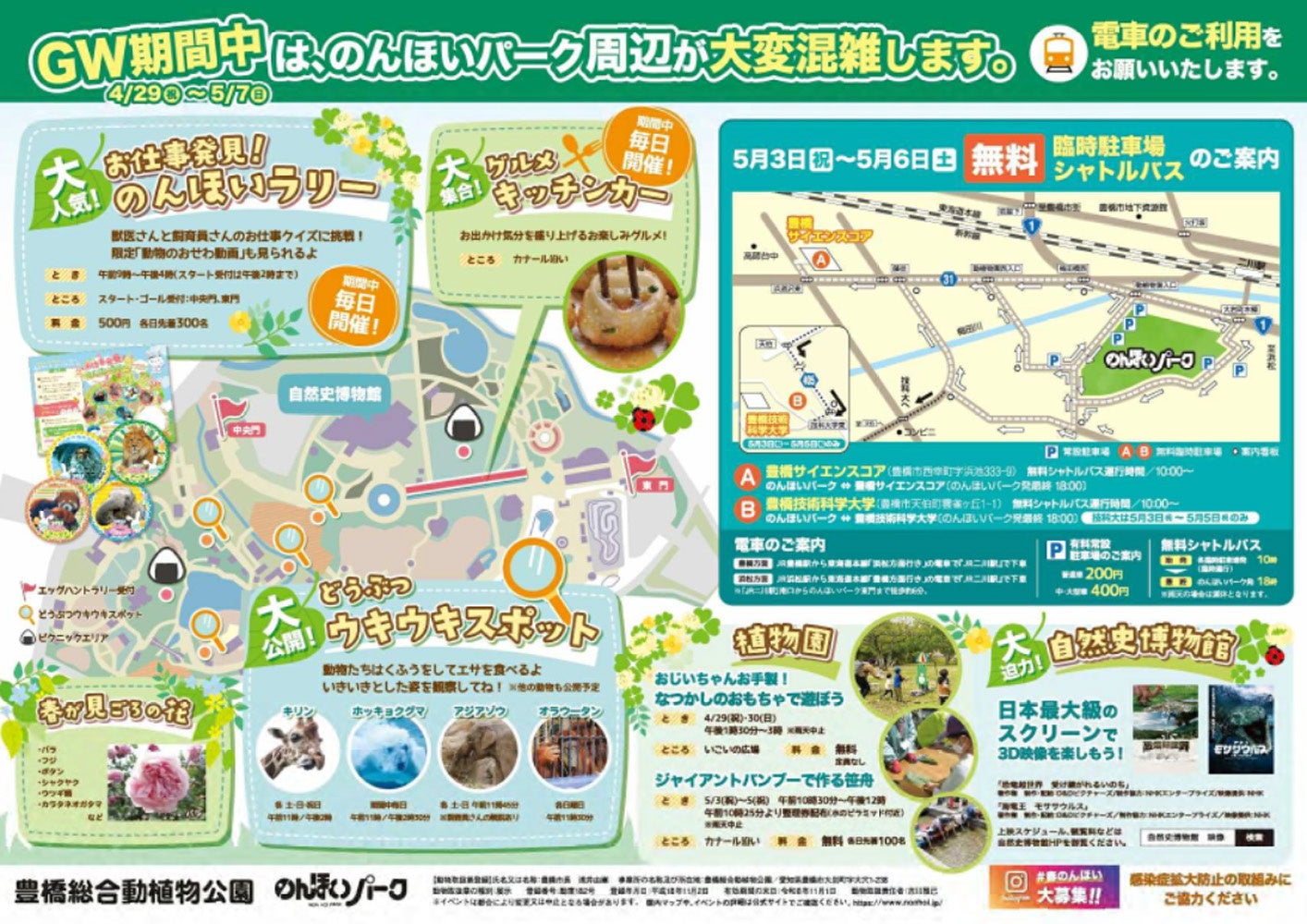 *期間中、のんほいパーク周辺は大変混雑しますので、電車でのご来園にご協力ください。お車でお越しの場合は無料の臨時駐車場もご利用ください。無料臨時駐車場では無料シャトルバスの送迎もあります。