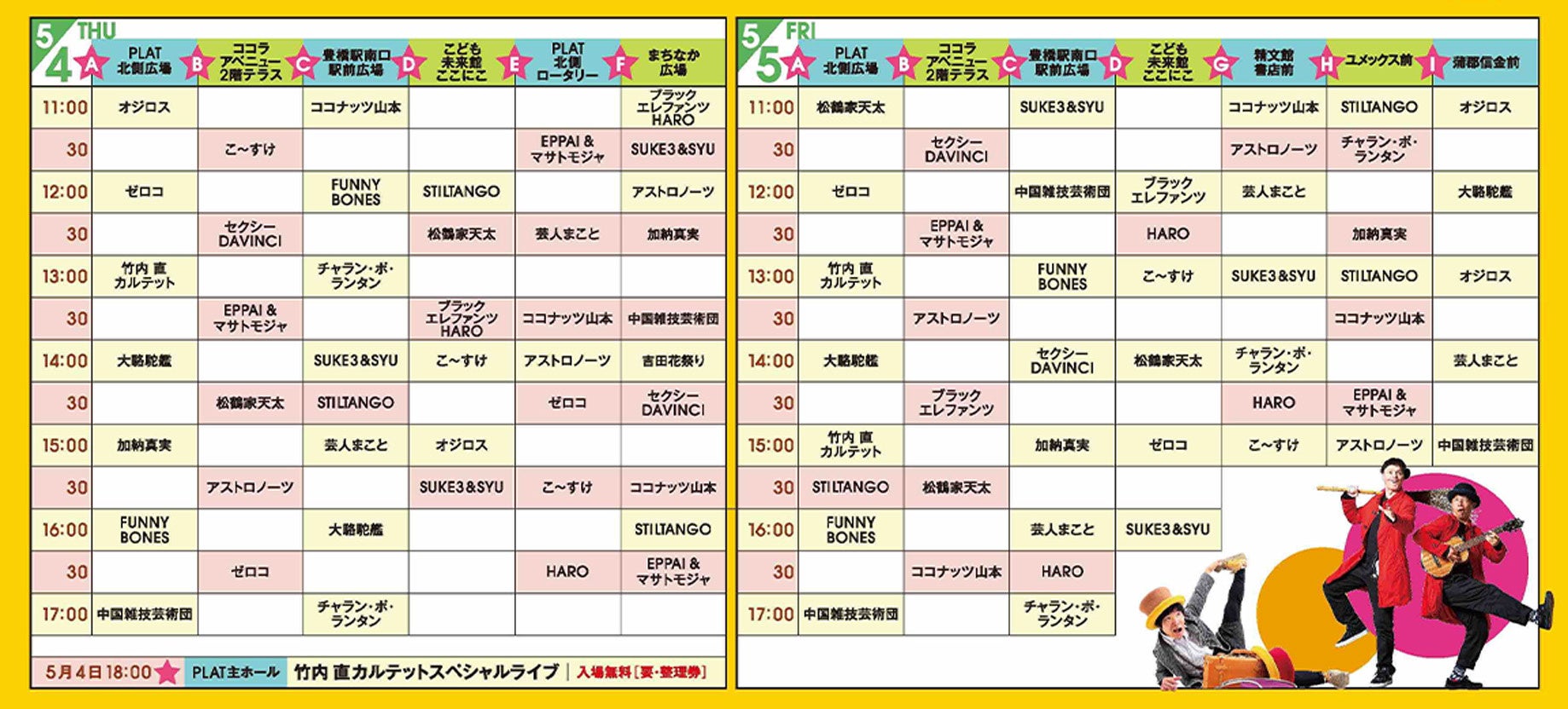 4年ぶりにまちなかに登場!マイムにアクロバット、JAZZなど世界で活躍する大道芸人たちが野外でパフォーマンス。2日間とも11時〜夕方までたっぷり総勢19組のパフォーマーがまちなかの至る所でパフォーマンスを繰り広げます!4日夜にはスペシャルライブ、5日には歩行者天国でもパフォーマンスを実施!