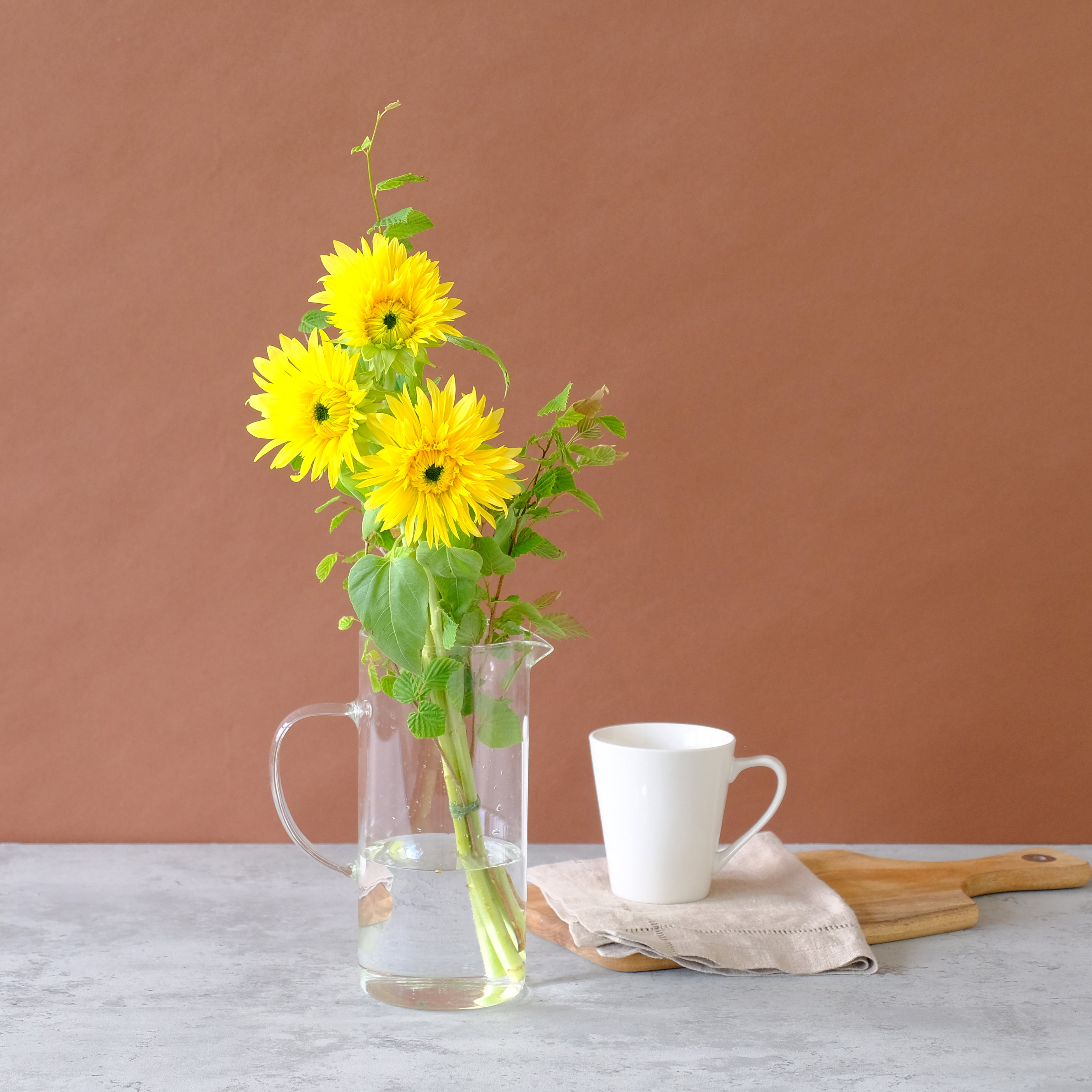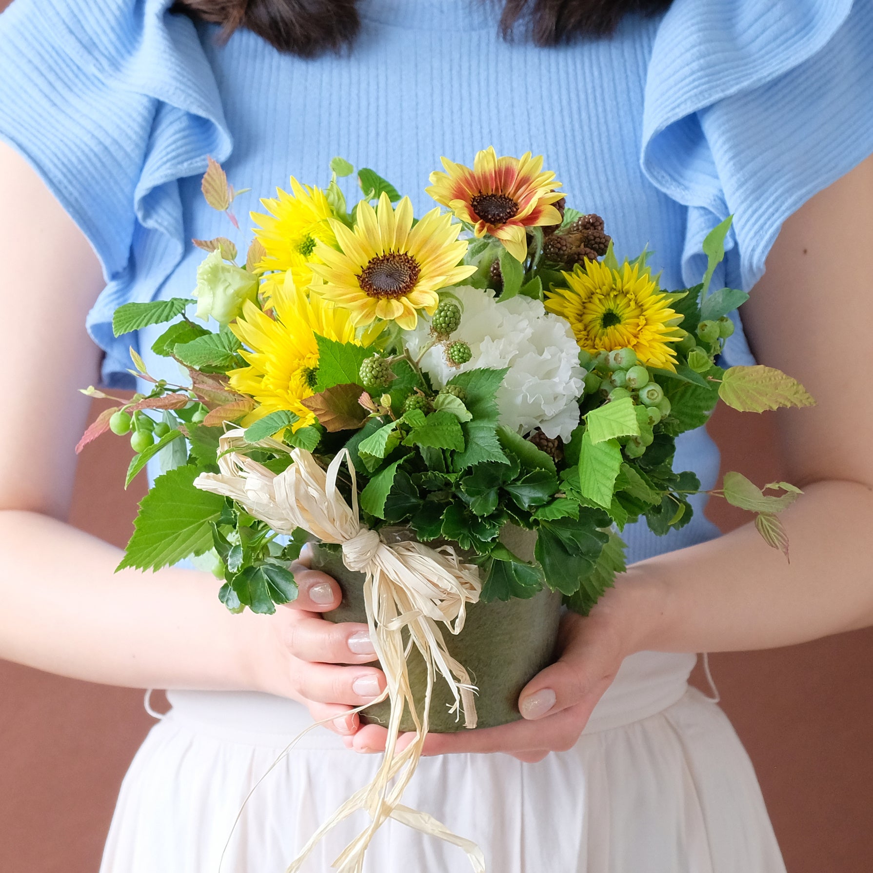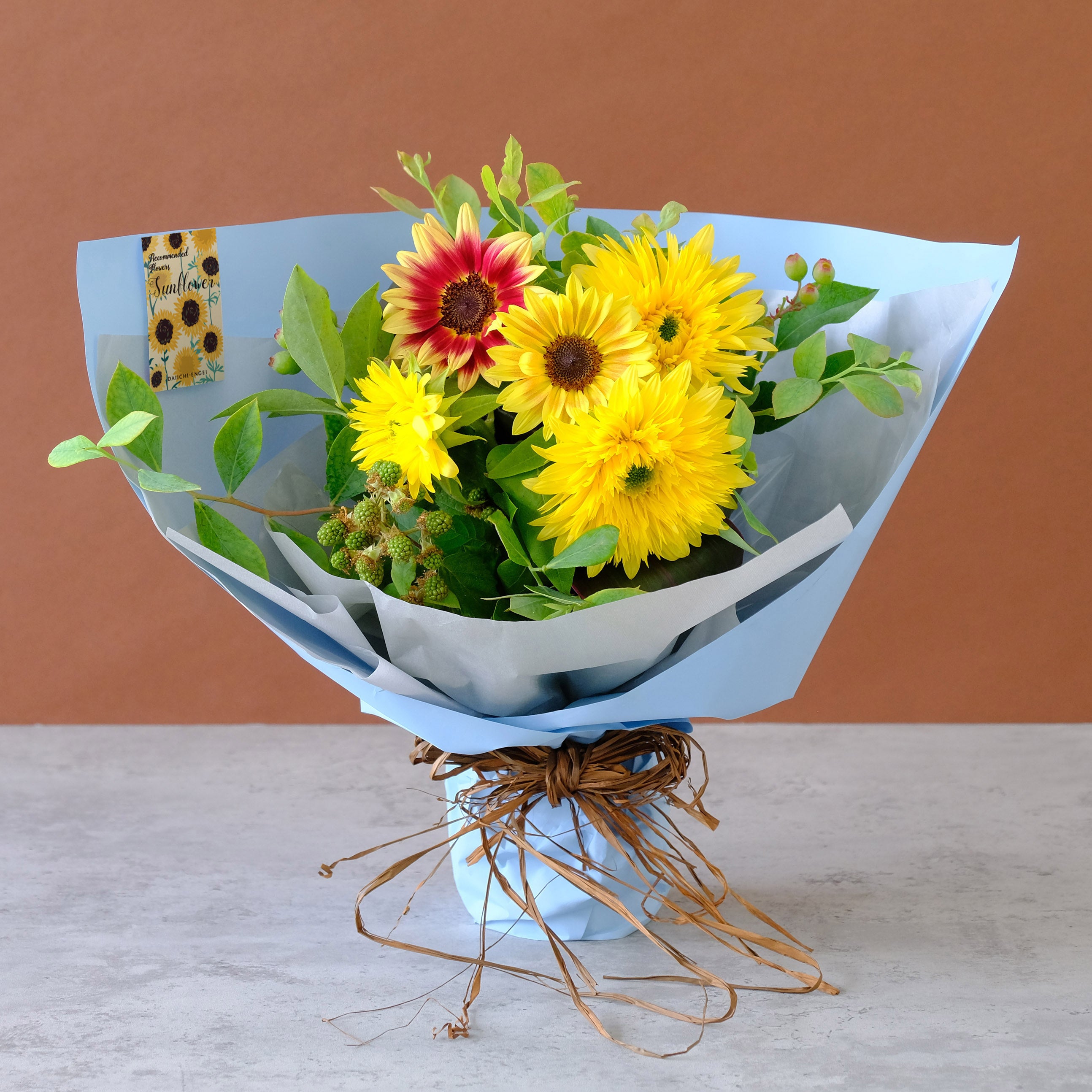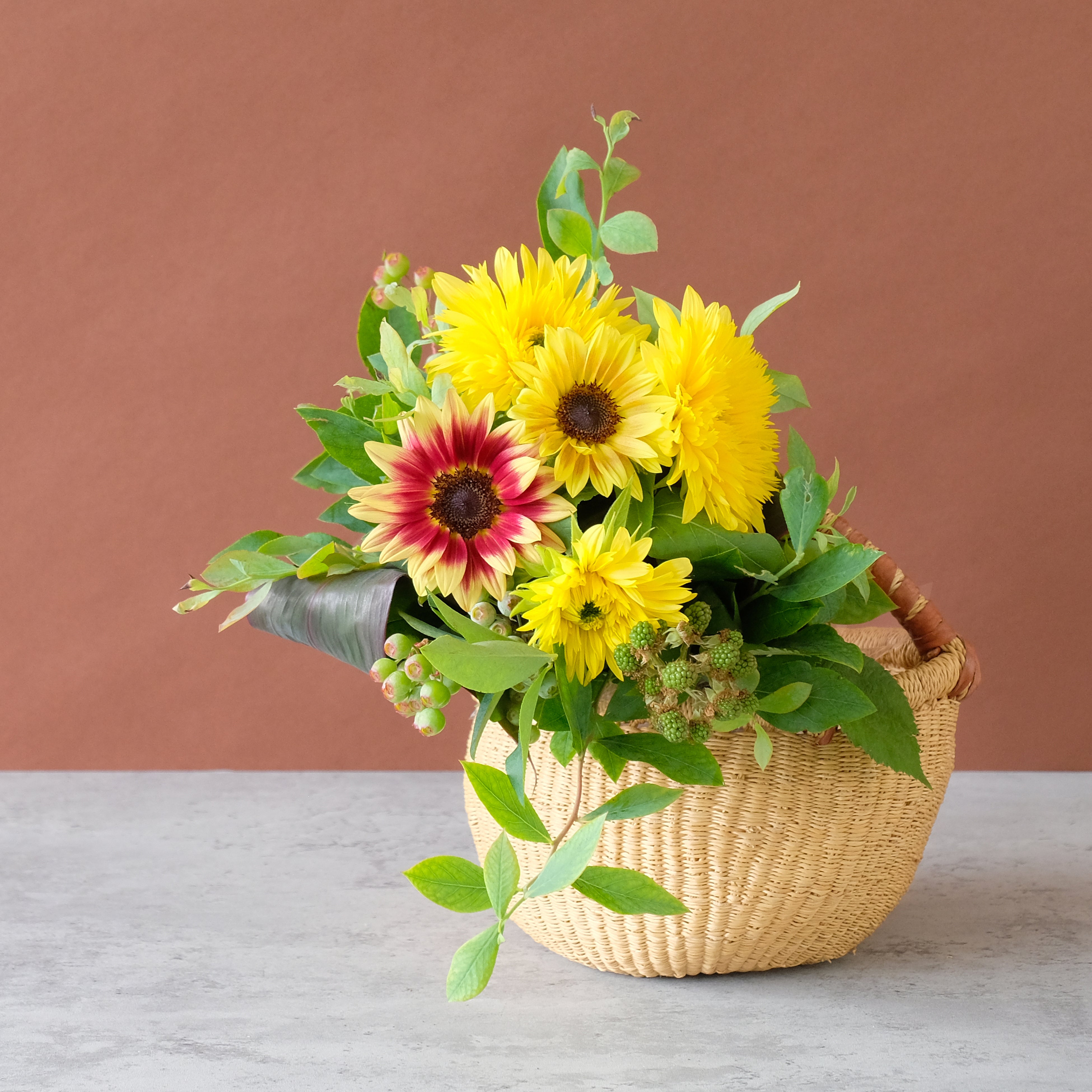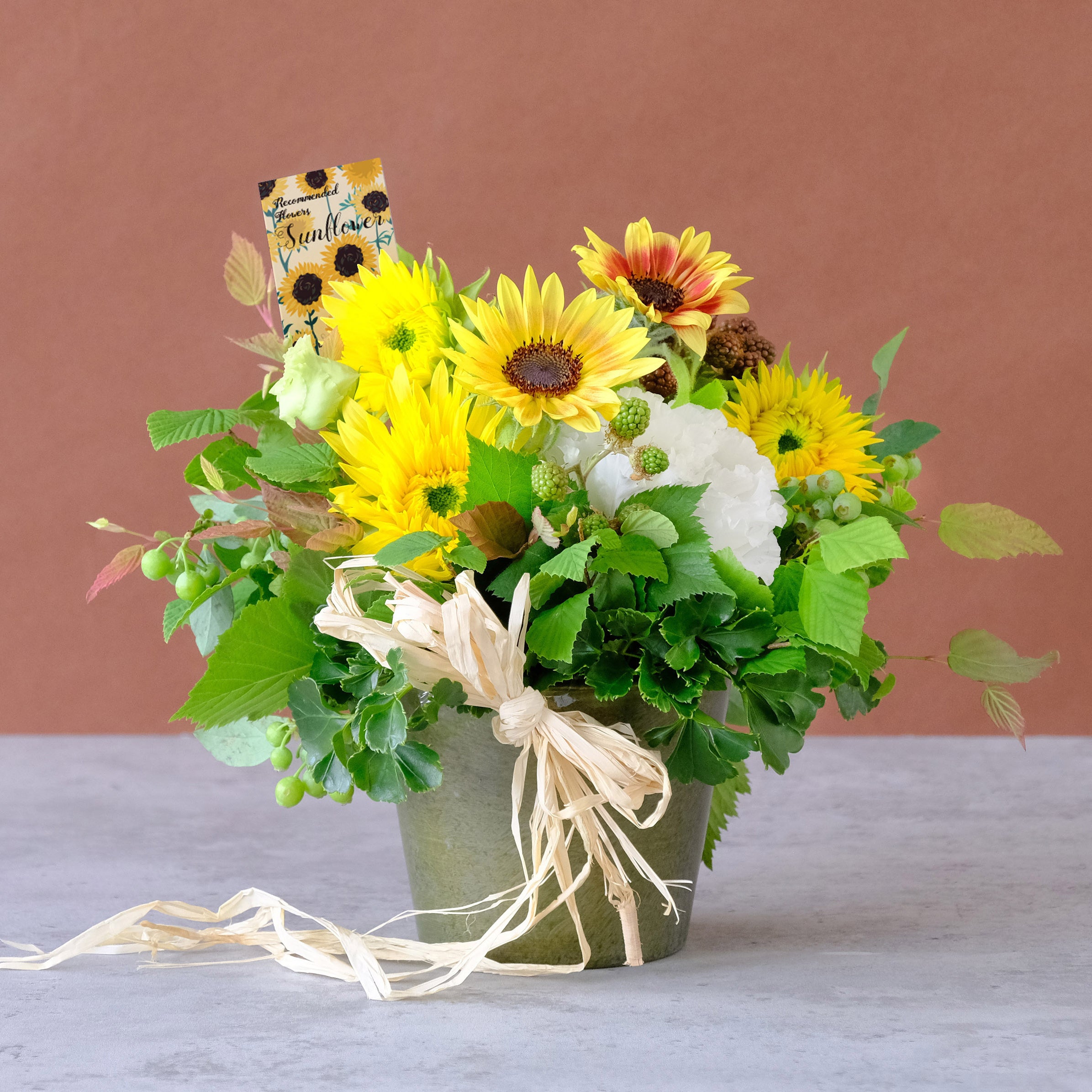 小ぶりで飾りやすいヒマワリに季節の枝ものを合わせました。気軽なプレゼントやご自宅に季節感を取り入れるアイテムとしておすすめです。