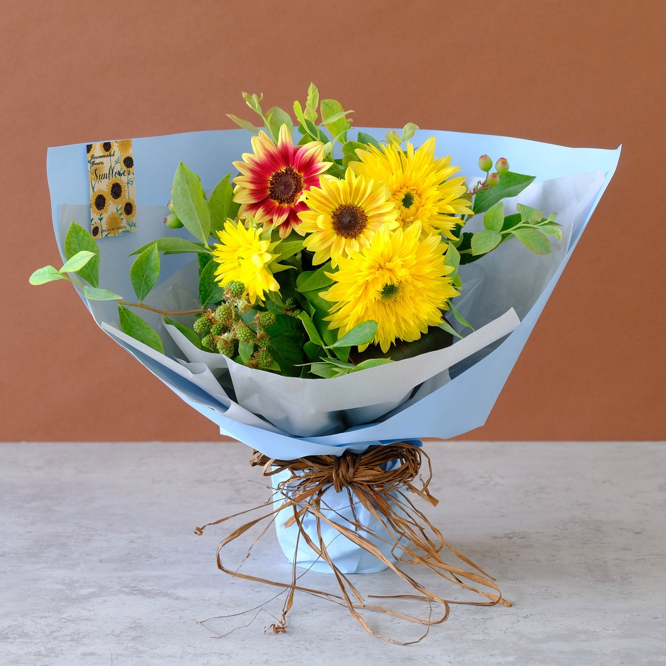 表情豊かなヒマワリと季節の枝ものを束ねてボリューム感のあるブーケにしました。夏ならではの明るさと清涼感を伝える贈り物です。