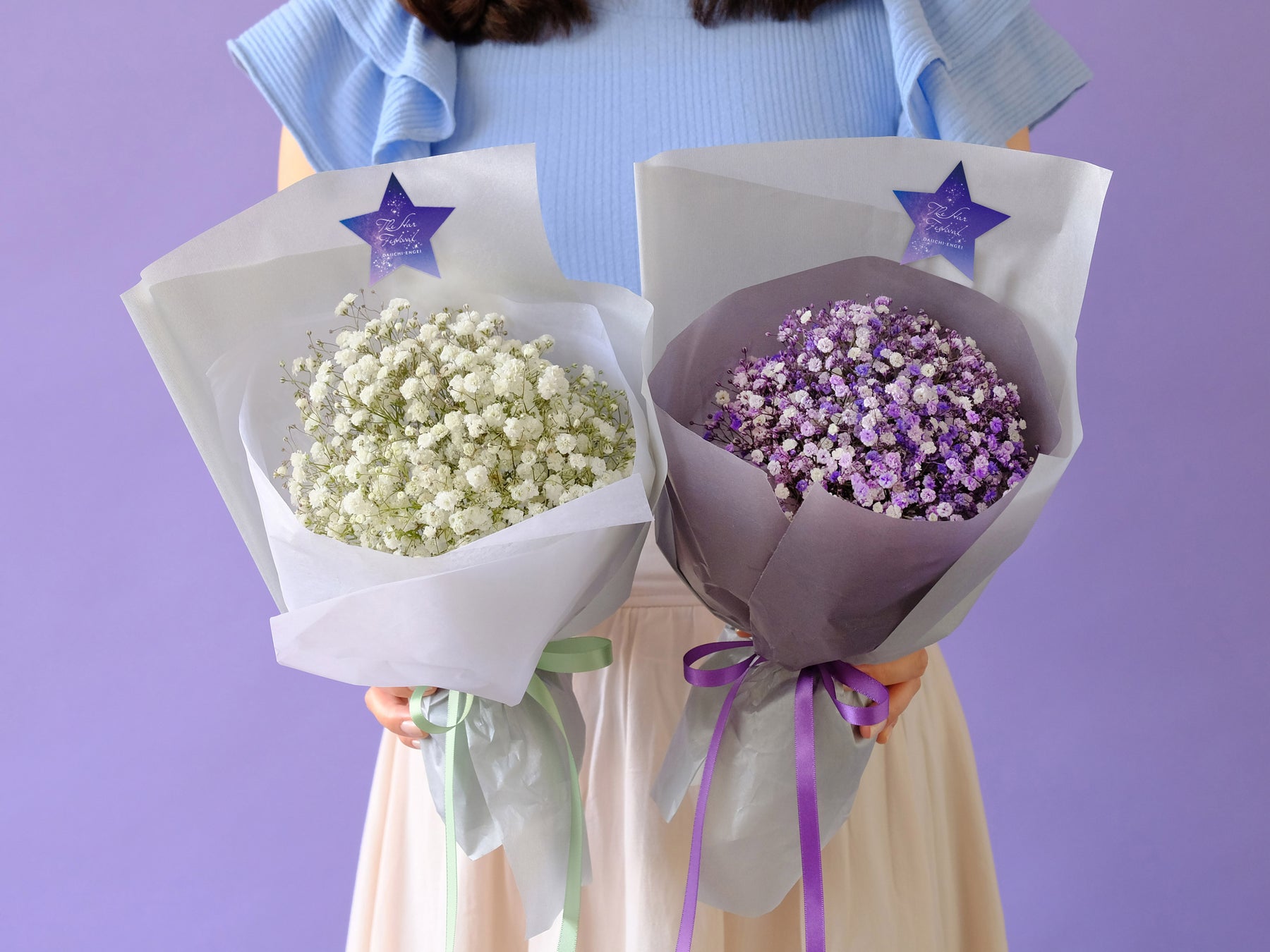 カスミソウだけを使って、束ねたブーケです。コンパクトでありながら、カスミソウがぎゅっと詰まってボリューム感満点。ホワイト系とパープル系、2つの色タイプをご用意しました。
