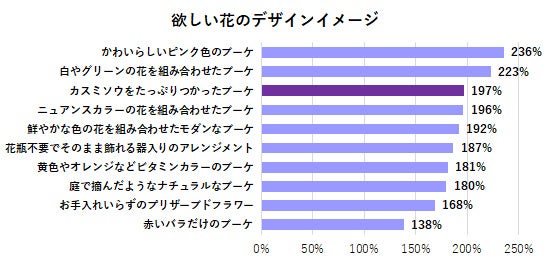 当社が実施した「花に関するアンケート調査2024※」で、欲しい花のデザインイメージを聞いたところ、「カスミソウをたっぷりつかったブーケ」が3位に選ばれました。調査結果からもわかるように、カスミソウは他の花の引き立て役ではなく、主役級の花として高い人気を得ています。さまざまな色に染めたカスミソウが増えたことも、カスミソウ人気に拍車をかけています。 そして、7月7日の七夕は、星屑のような花が天の川を思わせることからカスミソウの日とされています。感謝や幸福といった花言葉を込めて、大切な方へ人気のカスミソウのブーケを贈りませんか?