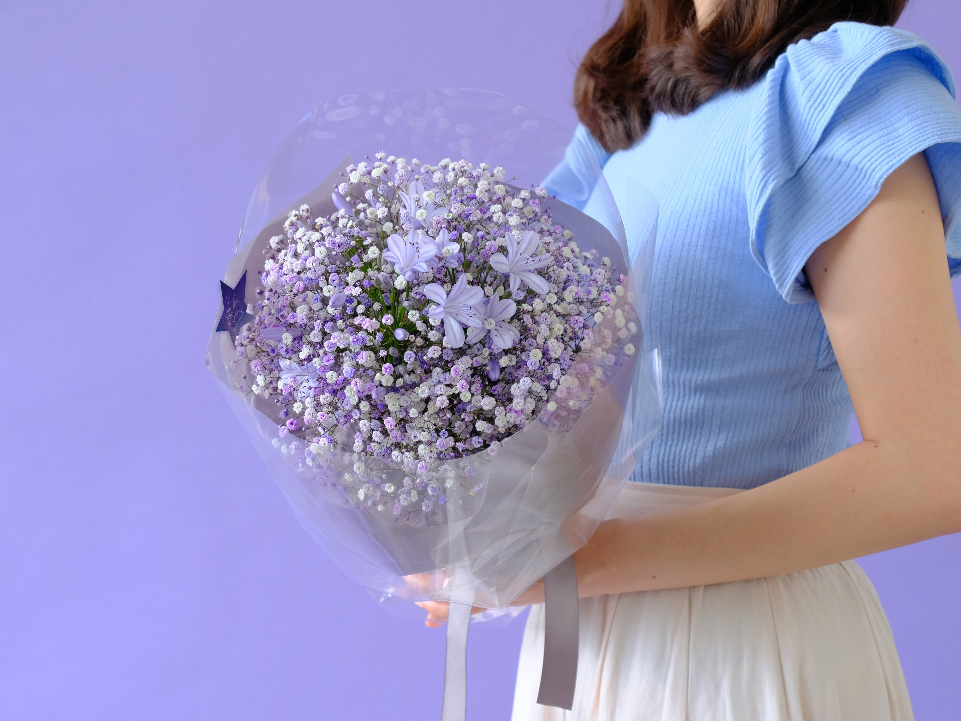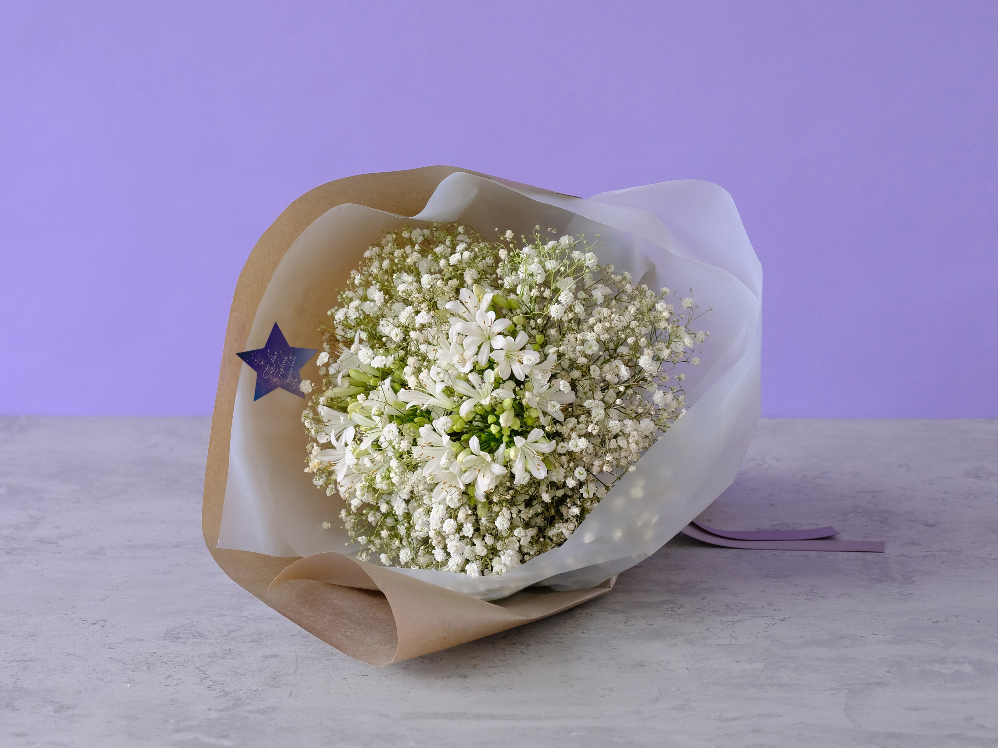 カスミソウと「恋の訪れ」や「ラブレター」の花言葉を持つアガパンサスを組み合わせたブーケです。清楚な白の『天の川』と淡い紫がエレガントな『星合(ほしあい)』をご用意しました。