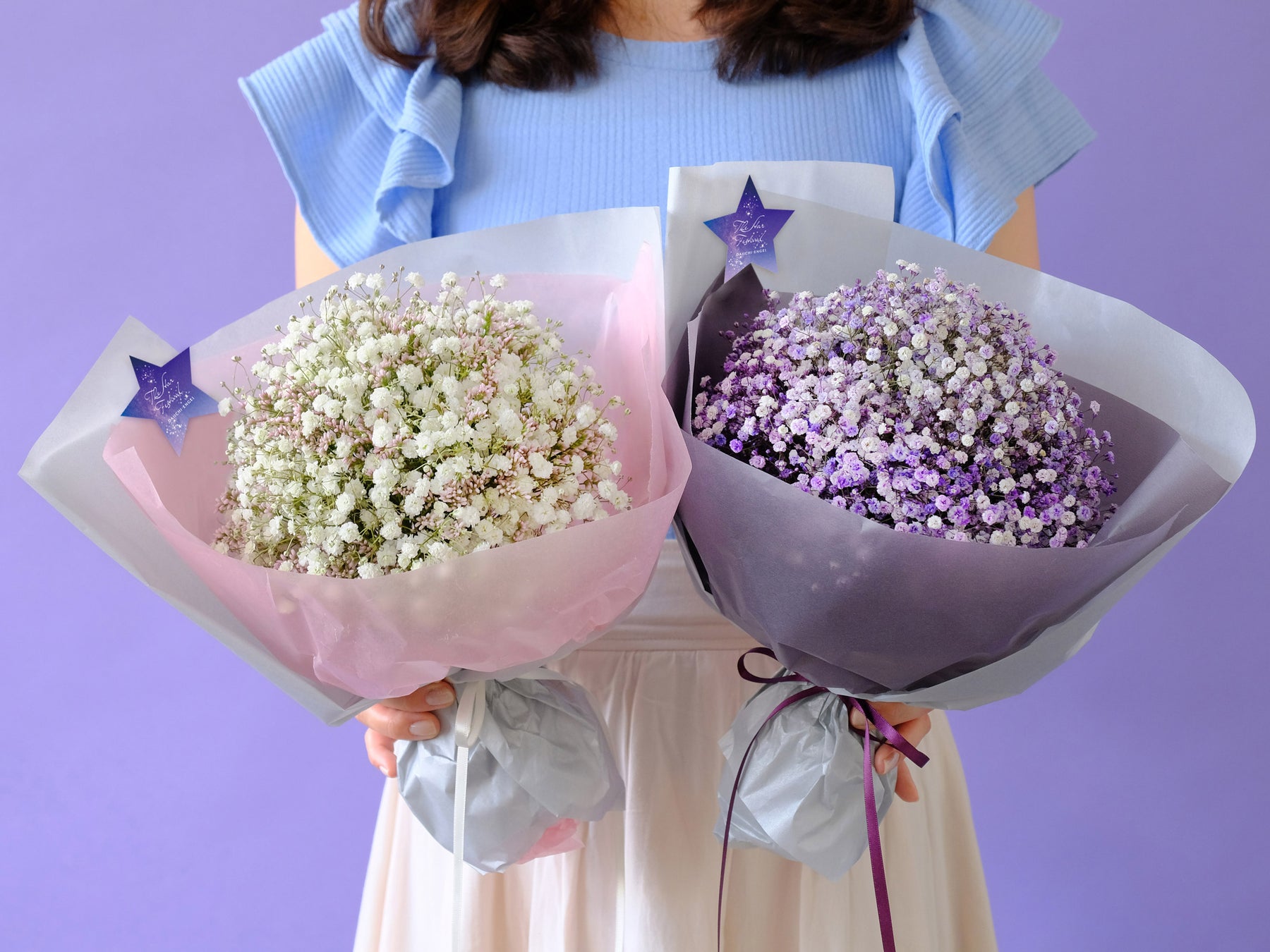 カスミソウを丁寧に束ねて、丸い形に仕上げたブーケです。白いカスミソウには淡いピンクのハイブリッドスターチスを加えて、可愛らしい雰囲気に。パープル系のブーケは染めた紫のカスミソウだけをたっぷりと使用してロマンティックな雰囲気に仕上げました。