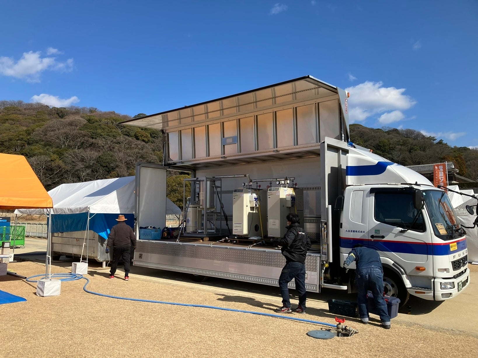 足湯ブースでは、道後温泉のお湯を引き入れ、弊社の電気ボイラを用いて適温に加温し、ランナーの皆さまの疲れた心身を癒す場としてご提供しました。当日は行列ができるほどの賑わいを見せ、多くの方にご利用いただきました。