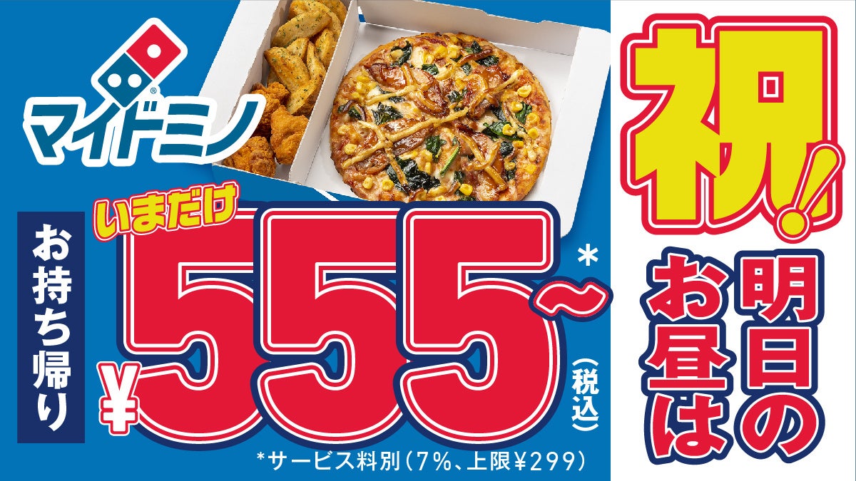 株式会社ドミノ・ピザ ジャパン(代表取締役:ジョシュア・キリムニック、CEO:マーティン・スティーンクス、本社:東京都品川区)が展開する国内No.1シェアを誇る宅配ピザチェーン ドミノ・ピザは、3月9日(木)から『Go! Go! Go! キャンペーン』※を開催中です。この度、このキャンペーンの一環として、明日、3月10日(金)のランチタイムの11時から16時までの間、「マイドミノ(My Domino’s)」をお持ち帰り限定で、555(Go! Go! Go!)円*~でご提供することを緊急決定いたしました。「マイドミノ」は、お好きなメインに、お好きなサイドメニュー2個をセットにしたおひとり様用のピザセットです。スポーツ観戦の歓喜に包まれた興奮が冷めやらぬ明日のランチは、ピザ、ポテトフライ、からあげの最強セットで、応援のためのエネルギーチャージをしてください。ドミノ・ピザはスポーツに夢中なファンを全力で応援します。今後も、引き続き、お得なご提案を続けてまいります。今週末にかけて、ドミノ・ピザ公式Twitterのツイートに引き続きご注目ください。