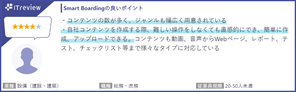 株式会社FCE(本社:東京都新宿区、代表取締役:石川淳悦、東証9564)が提供する、社員教育プラットフォーム「Smart Boarding」(スマートボーディング)(https://www.smartboarding.net/)は、アイティクラウド株式会社が主催するアワード「ITreview Grid Award 2024 Summer」の「 LMS/eラーニングシステム」部門において、満足度・認知度ともに優れた製品であると評価され、最高位である「Leader」を受賞しました。