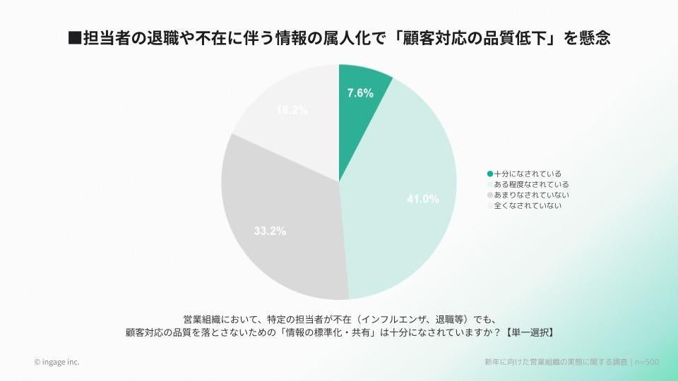 担当者の不在や退職時に顧客対応の品質を落とさないための「情報の標準化・共有」が十分になされている組織はわずか7.6%で、多くの現場で情報の属人化が深刻な懸念事項となっている。