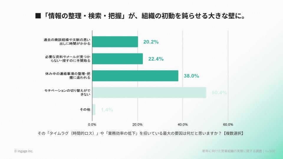 タイムラグを招く要因として、モチベーションの切り替え(50.4%)に次いで、「休み中の連絡事項の整理・把握(38.0%)」や「必要な資料・メールの検索(22.4%)」、「過去の商談経緯の思い出し(20.2%)」といった実務面が上位を占めています。これは、単なる「やる気」といった精神論ではなく、情報の分断や検索コストといった「実務的な仕組み」の不全が、組織の生産性を物理的に阻害していることを示しています。