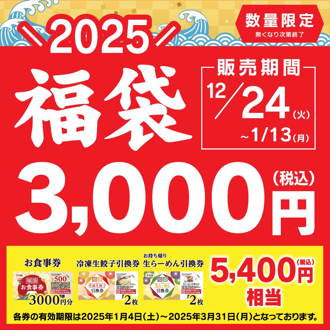 さらに、12月24日(火)からは、総額5,400円相当の引換券がセットになった、お得な「福袋」3,000円(税込)も数量限定で販売開始いたします。