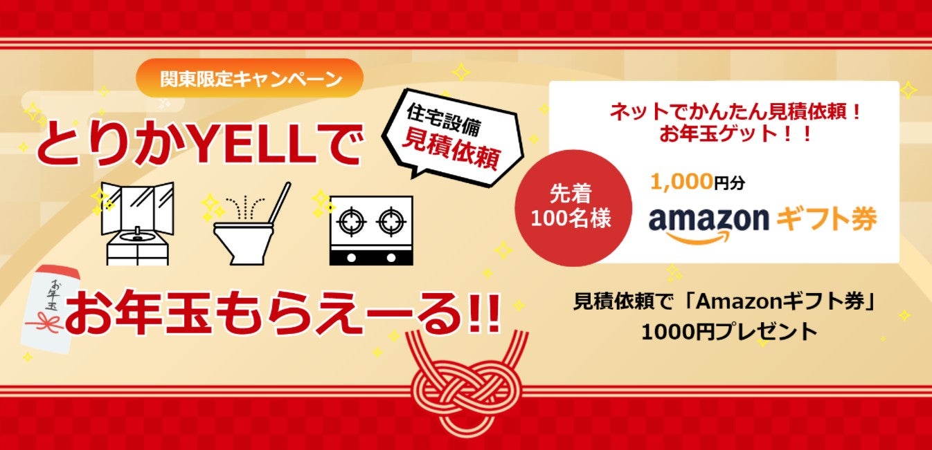 ケイアイスター不動産株式会社(本社/埼玉県本庄市、代表取締役/塙 圭二、以下 「当社」と言う。)は、住宅設備機器交換の請負サービス「とりかYELL(えーる)」において、「とりかYELLで住宅設備の見積依頼!お年玉が!もらえーるキャンペーン2022」(以下「本キャンペーン」と言う。)を2021年12月27日(月)に開始しました。期間中に住宅設備機器の交換見積を依頼されたお客様で、住宅設備に関するアンケートにご回答いただいた方を対象に、1,000円分のAmazonギフト券を先着100名様にプレゼントいたします。