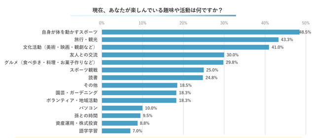 現在の趣味に関する設問では、「自身が体を動かすスポーツ」が48.5%ともっとも多く、次いで「旅行・観光」(43.3%)「文化活動」(41.0%)となりました。心身の健康維持や体験型の余暇が上位に挙がり、余暇を通じた刺激や学びを重視する姿勢がうかがえます。