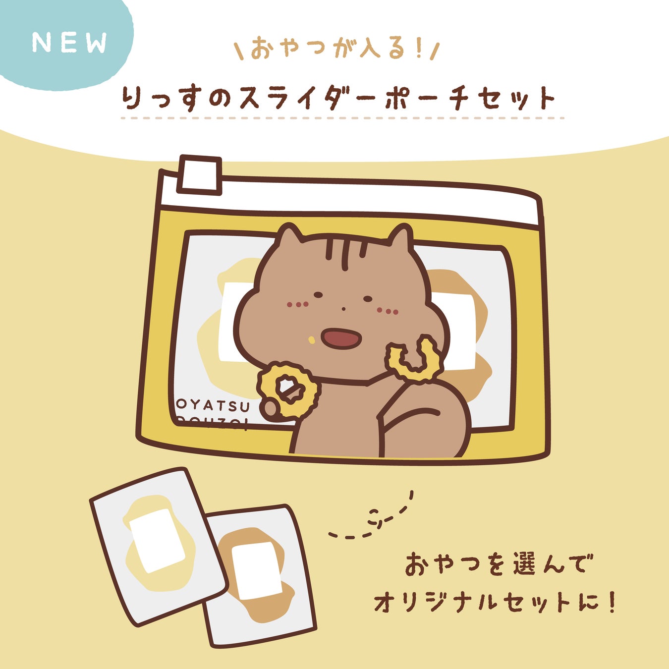 店舗限定のりっすスライダーポーチを新発売!おやつが2個ぴったり入るサイズ感で、おやつを入れるのはもちろん、ちょっとした小物を入れるのにもぴったり。