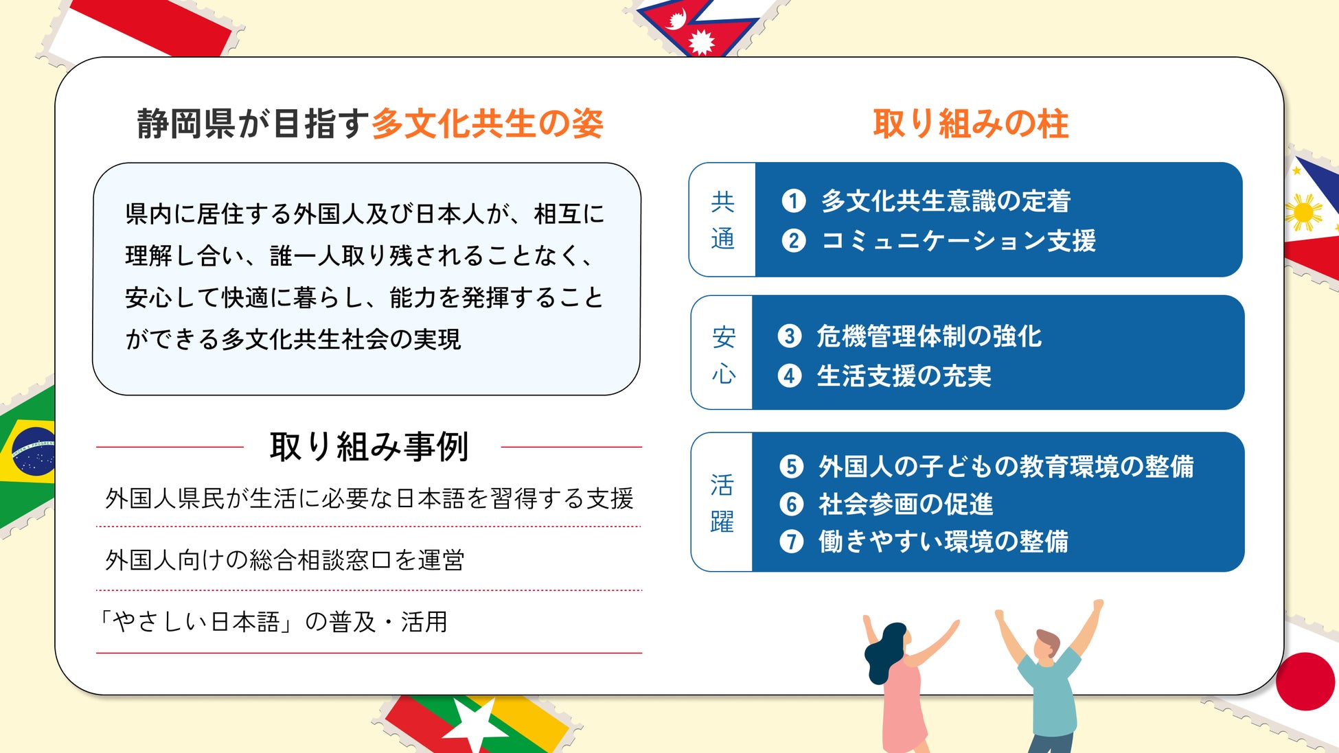 静岡県では、県内に居住する外国人および日本人が、互いに理解・尊重し合いながら、安心して快適に暮らし、持てる力を発揮できる「多文化共生社会」の実現を目指しています。2022年4月には「第3期静岡県多文化共生推進基本計画」を策定し、「共通」「安心」「活躍」の3つの柱を掲げ、地域日本語教育の推進や、やさしい日本語の普及、生活支援、社会参画促進などの具体的な施策を展開してきました。